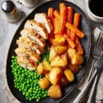 This Air Fryer Roast Dinner is a delicious and healthier take on the traditional Sunday roast, featuring crispy golden potatoes, tender roasted chicken breast with crispy skin, perfectly cooked carrots, and warm peas, all prepared using an air fryer for a quick and easy meal.