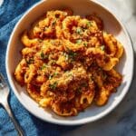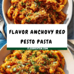 This vibrant Anchovy Red Pesto Pasta combines roasted red peppers, anchovies, walnuts, and parmesan into a bold and flavorful sauce, topped with a crispy garlic pangrattato for added texture. Perfectly coated short pasta like casarecce or fusilli brings the rich, spicy, and savory notes together in a satisfying Italian-inspired dish.