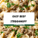 Keywords: Beef Stroganoff, Ground Beef Recipe, Mushroom Soup, Creamy Beef Noodles, Quick Dinner