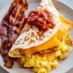 - Add Fillings: On the bottom left quadrant of the tortilla, spread the scrambled eggs. On the bottom right, place the crispy hash browns. On the top right, add the cooked bacon or sausage pieces, if using. On the top left, sprinkle the shredded cheddar cheese. Spoon salsa over your preferred fillings as desired.