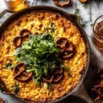 This Buffalo Chicken Corn Dip is a creamy, spicy, and cheesy appetizer perfect for game day or any party. It combines shredded chicken, fresh corn, tangy buffalo sauce, ranch dressing, and a blend of cheeses, baked to bubbly perfection and served with crunchy hard pretzel twists for dipping.