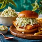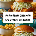 This Caesar Brussels Slaw & Parmesan Chicken Schnitzel Burger is a delightful twist on the classic chicken sandwich. Crispy, golden schnitzel meets a tangy, flavorful Brussels sprout slaw for a satisfying and unique burger experience.