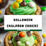 Cauldron Cookies are spooky, fun Halloween treats made from rich Devil’s Food cake mix cookie dough, topped with a vibrant green glaze that resembles a bubbling potion. Decorated with festive sprinkles, candy eyeballs, and pretzel stick handles, these cookies are perfect for a themed party or festive dessert table.