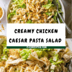 Keywords: Chicken Caesar Pasta Salad, rotisserie chicken salad, pasta salad, Caesar dressing salad, garlic panko breadcrumbs, easy pasta salad