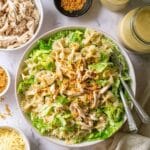 - Assemble: Add the cooled pasta, shredded chicken, toasted garlic panko breadcrumbs, and freshly grated Parmesan cheese to the bowl with the chopped lettuce. Pour the Caesar dressing over the salad.