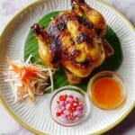 Chicken Inasal is a flavorful Filipino grilled poussin marinated in a vibrant mixture of garlic, ginger, lemongrass, citrus juices, and achuete oil. This recipe features a smoky and tangy marinade with a basting butter that adds richness and vibrant color. The poussins are first seared on a griddle pan for a crisp golden skin, then finished in the oven for a juicy, tender finish. Served on toasted banana leaves with pickled atchara and a tangy sinamak dipping sauce, this dish is a delicious celebration of Filipino flavors.