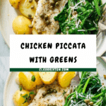 Chicken piccata is a bright and flavorful dish featuring tender chicken breasts in a zesty lemon and caper sauce. Served with garlicky greens and new potatoes, this meal is both comforting and fresh—perfect for a satisfying weeknight dinner.