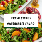 Keywords: Watercress salad, Citrus salad, Healthy salad, Arugula salad, Yogurt dressing, Pomegranate seeds, Almonds, Light lunch, Easy salad recipe