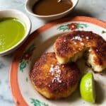 Two golden-brown fried patties with a crispy texture are placed on a white plate with floral patterns around the edge. One patty is whole, and the other is broken in half, showing the soft, pale yellow inside. Coarse salt flakes are sprinkled on the patties. A bright green lime wedge sits next to the patties on the plate. Above the plate, there are two small white bowls; one contains a smooth, bright green sauce, and the other holds a darker, brown sauce with a slightly glossy surface. The scene is set on a white marbled textured surface. Photo taken with an iphone --ar 4:5 --v 7