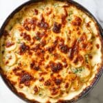 A round white cast iron pan filled with a creamy scalloped potato dish, showing multiple layers of thinly sliced, pale yellow potatoes underneath a golden brown, bubbly, melted cheese crust with dark caramelized spots across the surface, and small green herb sprinkles scattered lightly on top; the dish sits on a white marbled texture background. photo taken with an iphone --ar 4:5 --v 7