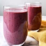 Two clear tall glasses filled with a thick, smooth purple smoothie with small dark specks. The front glass is larger and almost full, showing a glossy surface on top, while the second glass is smaller, set slightly behind and to the right, also almost full. Both glasses are placed on a white marbled surface with a soft yellow cloth casually draped near the smaller glass. The background is simple and white. photo taken with an iphone --ar 4:5 --v 7