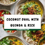 This creamy coconut and spinach dhal is a comforting, flavorful dish that combines tender red lentils with rich coconut milk and fresh spinach. Perfect for a cozy meal, it’s paired beautifully with a fluffy quinoa and rice blend and a fresh, zesty kachumber salad.