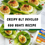 Crispy BLT Deviled Egg Boats bring a creative twist to classic deviled eggs with the addition of crunchy garlic panko and flavorful bacon. These bite-sized bites combine creamy egg filling, crispy coating, and fresh lettuce for a delightful appetizer or snack.
