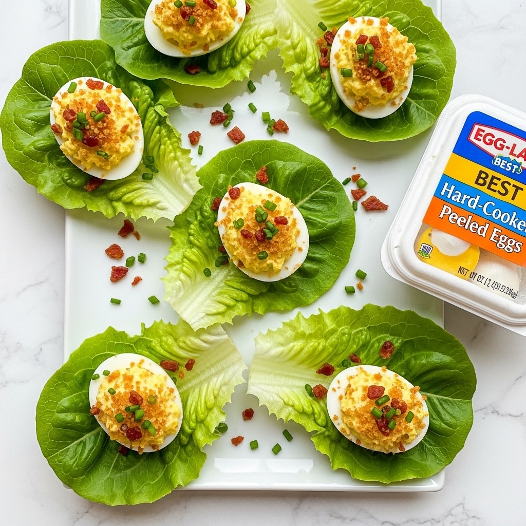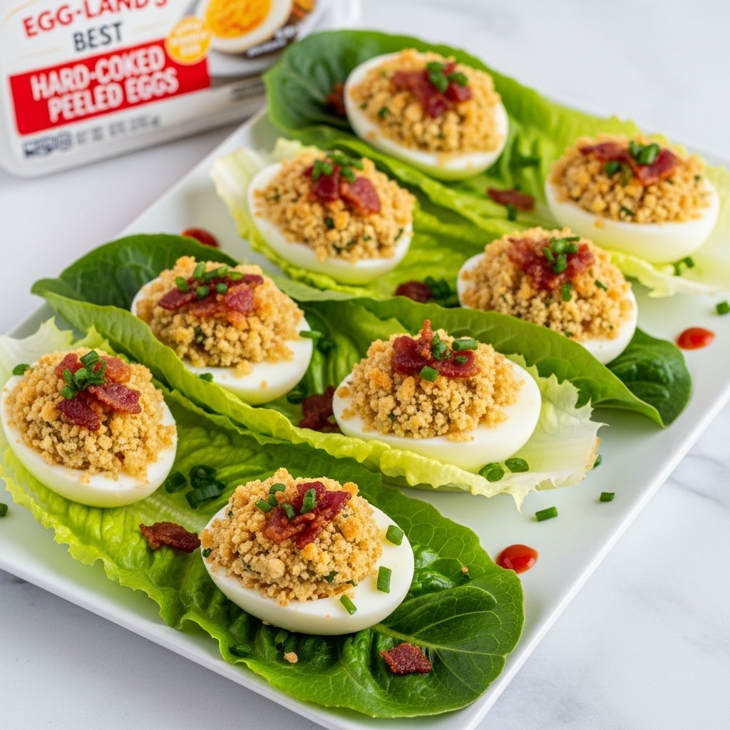 4. Assemble Lettuce Boats: Trim the ends off the lettuce leaves to create approximately 5-inch long ‘boats.’ Spoon and spread the reserved egg filling mixture evenly over the base of each lettuce boat. Top each with crumbled cooked bacon and one of the crispy, crumb-coated deviled eggs. Garnish with freshly chopped chives. Arrange on a serving platter and serve immediately for best texture and flavor.