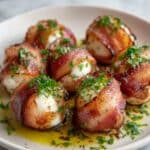 These Easy Beef Prosciutto Wrapped Mozzarella Bites are a delightful no-cook appetizer featuring creamy fresh mozzarella balls wrapped in thinly sliced beef prosciutto, accented with fresh basil and optional cherry tomatoes. Drizzled with olive oil and balsamic glaze, these elegant bites are perfect for parties, gatherings, or a sophisticated snack.