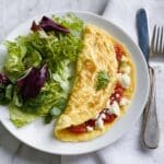 A simple and delicious Feta & semi-dried tomato omelette that combines creamy feta cheese and flavorful semi-dried tomatoes for a quick and satisfying breakfast or light meal, served with fresh mixed salad leaves.