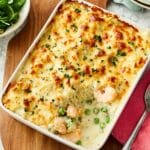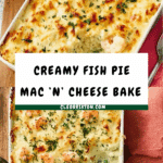 A comforting and hearty Fish Pie Mac ’n’ Cheese combining creamy mustard-infused cheddar sauce with macaroni, mixed smoked and white fish, peas, and fresh parsley, baked to golden perfection. This dish offers a delicious twist on classic mac and cheese with added protein and flavor from the fish pie mix.