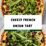 This French onion tart features a buttery thyme-infused cheesy pastry filled with sweet, caramelised onions and a rich, creamy egg custard. Topped with a fresh rocket and sundried tomato salad, it’s a delicious savory tart perfect for lunch or a light dinner.