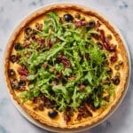 This French onion tart features a buttery thyme-infused cheesy pastry filled with sweet, caramelised onions and a rich, creamy egg custard. Topped with a fresh rocket and sundried tomato salad, it’s a delicious savory tart perfect for lunch or a light dinner.