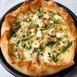 A delicious and vibrant frying pan filo tart packed with fresh spring vegetables, creamy butter beans, and tangy feta, all wrapped in crispy golden filo pastry. This easy-to-make dish combines sautéed spring onions, courgettes, peas, and mint with a light crème fraîche filling, perfect for a light lunch or dinner.