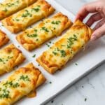 The image shows seven golden-brown rectangular pastry sticks lined up on white parchment paper over a white marbled surface. Each pastry has a bubbly, melted cheese layer on top, with small green herb bits sprinkled evenly across the surface. The edges of the pastries are slightly crispy and browned, with a flaky texture visible. A woman's hand is gently holding one pastry stick on the right side, lifting it slightly. The overall look is warm, cheesy, and inviting with a freshly baked appearance. photo taken with an iphone --ar 4:5 --v 7