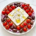 This Greek Baked Feta recipe offers a delightful combination of creamy feta cheese, juicy cherry tomatoes, olives, and red onions roasted together in olive oil and fresh oregano. Perfect as a warm appetizer or snack, this easy-to-make dish features vibrant Mediterranean flavors and is best served with pita chips or sliced bread.