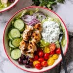 Keywords: Greek grilled chicken, chicken souvlaki, tzatziki sauce, Greek salad, Mediterranean chicken, healthy grilled chicken salad