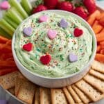 - Serve and Garnish: Once chilled, serve the Grinch Dip with your choice of dippers and consider garnishing with red candy hearts or festive sprinkles for a thematic touch.