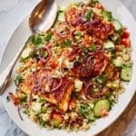 A flavorful and vibrant Harissa fish served with a refreshing bulgur salad, combining spicy and tangy harissa-marinated white fish with a crisp and colorful bulgur mixture packed with fresh vegetables and herbs.