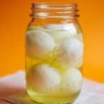 A clear glass mason jar filled with a pale yellow liquid and several white, round balls submerged inside, showing a slightly soft and smooth texture. The jar is placed on a white marbled surface with a piece of white paper partially underneath it, set against a bright orange background. The glass jar has a classic, smooth design with embossed lettering near the bottom. photo taken with an iphone --ar 4:5 --v 7