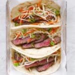 The image shows three soft white tortillas stacked side by side inside a white basket lined with white paper. Each tortilla is filled with three main layers: the bottom layer has thin, bright orange carrot strips mixed with shredded white cabbage and small pieces of green onion, giving a fresh, crunchy look. The middle layer contains medium-rare steak slices with a pink center and brown edges, placed evenly along the length of the tortillas. The top layer has scattered thinly sliced red peppers and green onions, adding bright color and texture contrast. The basket is placed on a white marbled surface. Photo taken with an iphone --ar 4:5 --v 7