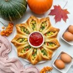 Indian Crescent Ring is a flavorful and visually stunning savory pastry dish featuring a spiced scrambled egg filling wrapped in flaky crescent roll dough and baked to golden perfection. This recipe combines traditional Indian spices like chili powder and turmeric with fresh ingredients such as onions, green chili, tomato, and cilantro, offering a unique fusion of textures and aromatic flavors. Perfect as an appetizer, snack, or light meal, it’s easy to prepare and impresses with its sunburst presentation.
