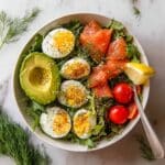 A refreshing and nutritious keto-friendly salad featuring smoked salmon, soft-boiled eggs, creamy avocado, and a zesty lemon dill dressing. Perfect for a light lunch or dinner, this salad combines fresh greens, cherry tomatoes, and flavorful seasonings for a flavorful and satisfying meal.