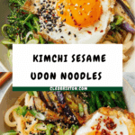 A vibrant and flavorful Kimchi Sesame Udon Noodles recipe featuring stir-fried vegetables, tangy kimchi, and perfectly cooked eggs, tossed with fragrant sesame oil and garnished with black sesame seeds and optional chili flakes for a spicy kick.