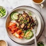 This Korean Ground Beef Bowl recipe is a quick and flavorful meal that combines savory, sweet, and spicy elements in just 15 minutes. Ground beef is cooked and simmered in a soy-based sauce with garlic, ginger, and sriracha, then served over rice with fresh cucumbers, optional kimchi, and a tangy spicy mayo drizzle. Perfect for an easy weeknight dinner packed with Korean-inspired flavors.