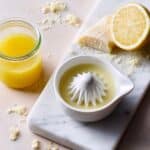 A top view of a white citrus juicer placed on a white marbled cutting board, containing freshly squeezed lemon juice with a white ridged center for pressing the lemon halves. To the right on the cutting board, there is a glass jar filled with smooth, thick, yellow lemon curd, and next to it is a squeezed lemon half showing its juicy, pulp-filled inside. In the top left corner, a small block of grated cheese or zest is slightly visible, resting on a white marbled surface with scattered flour or zest bits. photo taken with an iphone --ar 4:5 --v 7