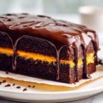 A rectangular chocolate cake with two thick dark brown layers sits on a white plate with parchment paper beneath it. Between the two layers, there is a thin, bright orange layer of filling. The top of the cake is covered with glossy, rich dark chocolate ganache, which flows down the sides in shiny drips. The cake texture looks moist and dense, and crumbs are scattered near the bottom edge. The setting has a soft, white marbled background. photo taken with an iphone --ar 4:5 --v 7