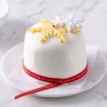 This Mini Christmas Cake is a festive, beautifully decorated cake perfect for holiday celebrations. Glazed with apricot jam, covered with smooth marzipan and white fondant icing, then adorned with delicate icing snowflakes, edible gold balls, and a festive ribbon, it brings elegance and seasonal charm to your dessert table.