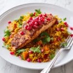 This one-pan tikka salmon with jewelled rice is a vibrant and aromatic dish that’s perfect for a flavorful weeknight dinner. Combining tender salmon with fragrant spices, sweet apricots, and fresh pomegranate seeds makes for a deliciously balanced meal all cooked in a single pan.