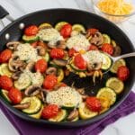 A delicious and easy Parmesan Vegetable Skillet featuring sautéed zucchini, yellow squash, mushrooms, cherry tomatoes, and garlic, all topped with melted shaved Parmesan cheese. This colorful and flavorful vegetarian dish is perfect as a side or light main course.