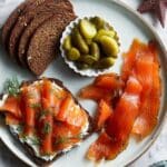 - Step 6: When ready to serve, place the salmon on a board and use a sharp knife to thinly slice, avoiding the skin layer. Serve with soft cheese, rye bread or bagels, dill pickles, and chopped dill for a delicious spread.