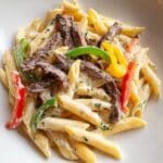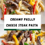 Keywords: Philly cheese steak pasta, steak pasta recipe, cheesy pasta, easy dinner, comfort food