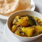 A white bowl filled with a thick yellow curry containing large chunks of soft potatoes, garnished with small green cilantro leaves and a visible curry leaf. The curry has a slightly oily surface with visible mustard seeds and other spices. Next to the bowl, two large, round, light brown, crispy papadums with a bubbly texture rest on a white plate. The setting is on a white marbled surface. photo taken with an iphone --ar 4:5 --v 7