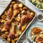 This roast chicken with squashed new potatoes and cheesy creamed spinach is a comforting, flavorful meal that’s perfect for any night of the week. Tender, juicy chicken pairs beautifully with crispy potatoes and a rich, creamy spinach side that the whole family will love.