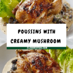 This elegant roast poussin recipe features tender baby chickens roasted to perfection, infused with garlic, thyme, and lemon, served alongside a luxurious wild mushroom sauce made from rehydrated dried morels or porcini, shallots, white wine, cream, and a touch of sherry. The dish is completed with a charred Baby Gem lettuce for added smoky flavor and texture, creating a sophisticated and flavorful meal perfect for special occasions.