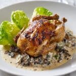 A roasted whole bird with browned, crispy skin sits on a layer of creamy mushroom sauce that has whole dark mushrooms mixed in. Behind the bird, there are two large, green lettuce wedges placed upright. The dish is served on a white plate, all set on a white marbled surface. The photo taken with an iphone --ar 4:5 --v 7