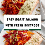 This roast salmon with pesto sauce and beetroot slaw is a vibrant, healthy meal that’s quick to prepare. The tender salmon pairs beautifully with the fresh, crunchy slaw and creamy pesto sauce for a deliciously balanced dish.