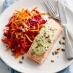 This roast salmon with pesto sauce and beetroot slaw is a vibrant, healthy meal that’s quick to prepare. The tender salmon pairs beautifully with the fresh, crunchy slaw and creamy pesto sauce for a deliciously balanced dish.