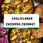 Keywords: cauliflower curry, chickpea curry, vegan curry, coconut curry, roasted cauliflower, plant-based meal, Indian-inspired