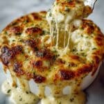 The dish is a baked cheesy casserole served in a round white ramekin filled to the top with soft, golden-brown cheesy dollops slightly puffed on the surface. The top layer has uneven browned spots with some melted cheese bubbling and sprinkled with herbs. A spoon lifts one cheesy dollop from the center, showing gooey, stretchy melted cheese strands pulling away from the dish. The edges of the ramekin have melted cheese dripping down, pooling on the white marbled surface beneath. Photo taken with an iphone --ar 4:5 --v 7